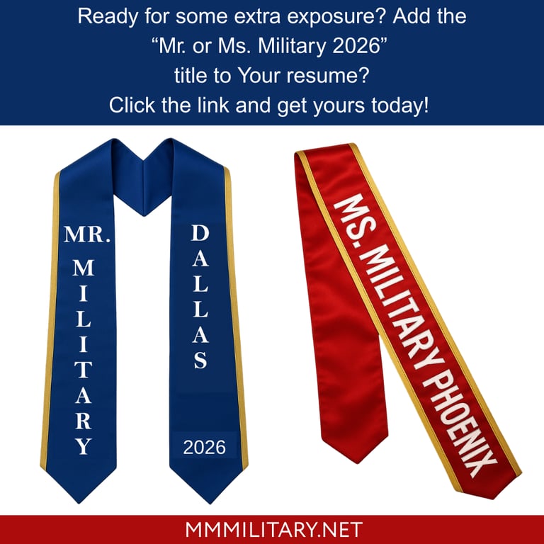 Are you ready to add the Mr. or Ms. Military 2026 title to your resume? You want to stand out from the crowd? Get noticed in your community? Get your title and certificate today! For a limited time the next 25 people that sign up will get a complimentary 3 night hotel stay on us, which will be good for one year. Sign up now while your city may still be available.